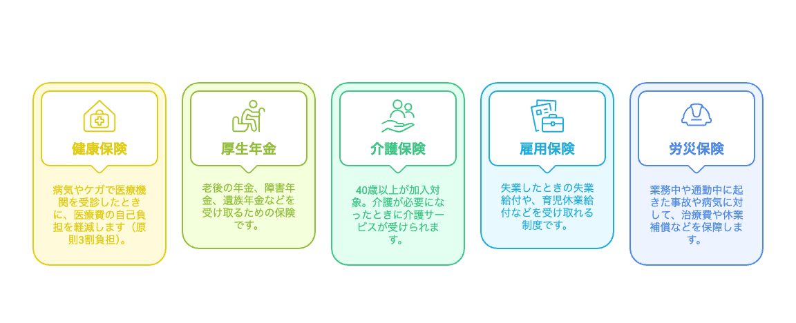 社会保険には主に以下の5つがあり、加入するには一定の条件を満たすことが必要となります。