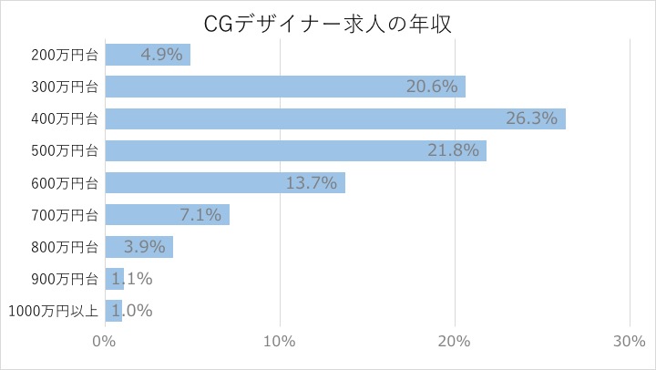 CGデザイナーの求人の給与情報から、CGデザイナーの年収帯を独自に集計しました。以上のグラフの通り、400万円台が26.3%と最も多く、次に500万円台が21.8%と続きます。
