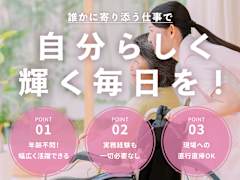 仕事内容訪問介護職 WEB×AI活用で個別ケアの実現◎年休暇平均133日 働きやすい職場です サービス提供責任者として一緒に働きませんか。 【年間休日124日】 いい仕事をするには、仕事以外のプライベートの時間も充実させることが重要です。やさしい手では、仕事もプライベートも楽しんでもらいたいという考えがあります。 趣味や、家族の時間を確保しながら働いてください。 【研修制度の充実】 サービス提供責任者は初めてだし・・なんだか不安・・ 大丈夫です しっかりとした教育体制、研修制度があるので安心です。 【やりがい】 お客様の在宅で最後まですごしてほしい・・ そのために私たちはなにができるか。何を