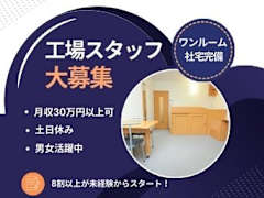 仕事内容月収30万円以上/社宅無料/住込みOK/家庭用エアコンの組み立て 8割以上が未経験スタート 軽作業で【月収30万円以上】稼げる人気のお仕事 家具備品付きの綺麗な社宅無料 ▼お仕事はとっても簡単 用意されたマニュアルを見ながら、自分のペースでコツコツと組み立てるだけ 流れ作業ではないので、1つずつモクモクと取り組めます。 専門的なスキルも必要ありません。 未経験から【月収30万円以上】の高収入をお約束します また、家具備品付きの1Rもしくは1Kのお部屋を無料でご用意していますので、遠方の方も赴任も大歓迎 ▼当社からのご案内 株式会社デクリックマネジメントは製造業専門の転職サポ