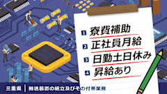 仕事内容株式会社GENSENS 人材サポート部(三重)の正社員/人材紹介/派遣社員の住み込みの仕事求人情報 未経験でも安心のカンタン作業!クリーンルームで快適&無料送迎あり◎ 企業名:株式会社GENSENS 人材サポート部 求人先名:株式会社GENSENS 【月収29万円以上可】電子部品の軽作業!フィルム貼り・検査など/未経験OK/寮費半額補助あり! 正社員/人材紹介/派遣社員の住み込み求人の募集 三重の住み込み求人 未経験でも安心のカンタン作業!クリーンルームで快適&無料送迎あり◎ \高収入×軽作業×寮サポート充実/ 大手電子部品メーカーでのお仕事!軽い部品のセットや簡単なフィルム貼り、検査作業など