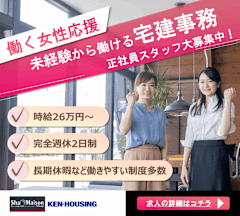 仕事内容| 当社で働くポイントをサクッとご紹介| 20-30代の方が、将来に備えるために最適な環境 一生どこの不動産会社でも通用するスキルが身に付く 資格取得支援あり!一生役に立つ資格を取れる! 産休や子育てなどでも無理なく働ける環境 今回は「本気で現状を変えたい!」という想いがある方と一緒に働きたいので、未経験でもご応募OKとさせていただいています。 TVCMでも有名な「シャーメゾンショップ」を運営する当社。 品質が高いため、お問合せが途絶えることはないんです。 だからこそ会社の業績は安定しており、社員も長く働いてくれる人が多いんですよ。 今回は営業さんのアシスタントに入る事務