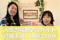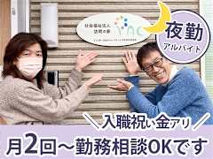 勤務時間・朝番6:00〜11:00(実働4.5h、休憩0.5h) ・昼番11:00〜16:00(実働4.5h、休憩0.5h) ・夜番19:00〜22:00(実働3h、休憩なし) ・夜間支援員22:00〜翌6:00(実働6h、休憩2h) ・夜勤16:00〜翌9:00(実働12h、休憩5h 0:00〜5:00) ★週1からOK! ★勤務時間帯は組み合わせOK!