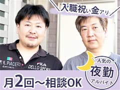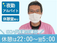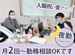 勤務時間■ シフト・勤務時間 週1日以上、1日4時間以上 =============== 【日勤】 下記のシフトで、 1日4h以上の勤務をお願いします! (1)7:00~19:00 【宿直】 15:30~翌9:00 ※実働12.5h / 休憩5h (仮眠時間は3h程度まとまって取れます) ※1ヶ月単位の変形労働時間制 =============== ★日勤のみ、宿直のみもOK! ■ 勤務できる曜日 月、火、水、木、金、土、日 ★平日のみ、土日のみOK!