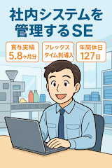 仕事内容【賞与平均5.8ヶ月分×年休127日】年収500万円可/フレックスタイム制あり/社内SE 【特徴・メリット】 経験者優遇 交通費支給 高収入・高時給 昇給・賞与あり 有資格者歓迎 第二新卒歓迎 フレックスタイム制度あり 残業月20時間以内 車通勤OK 長期 住宅手当あり 社会保険完備 固定時間制 受動喫煙対策: 屋内禁煙 【職種】 社内SE 【雇用形態】 職業紹介(正社員) 【給与】 年俸 4,000,000円〜5,000,000円 年収:400万円~500万円 ※年齢・経験を考慮のうえ決定 ※住宅手当(地域手当)含む 想定月給:227,000円~280,000円 固定残業制度: