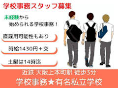 仕事内容<仕事内容> 学校事務員 入社2年目への契約更新時に、正社員へ希望される方は申請いただけます 【学校事務全般】 ・本校含む大阪市内の姉妹校4校の経理、労務、総務事務 ・各官公庁等への各種申請手続き ・学生対応(奨学金手続き、説明、在校生管理、学費納入管理、システム登録など) ・備品、消耗品などの手配 ※同時募集 パート契約社員 週3・4日出勤 1日4~6時間 時給1,114円~1,200円 <給与> 年収276万円~360万円 <勤務時間> シフト制 <休日休暇> 完全週休2日制 週休2日制 ・シフト制により1週間のうち2日休み ・日曜日、祝日 休み ・年間休日数:121日 ・6ヶ月