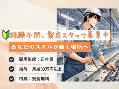 仕事内容【仕事内容】 化粧品のパッケージやボトルにシールを貼るだけのシンプル作業です。 ズレていないかをチェックして、仕上げを整える軽作業中心。 扱うのは軽い商品なので、体への負担も少なく安心してスタートできます! 【おすすめポイント】 ・未経験から始めやすい簡単ワーク! ・スピード採用で「すぐ働きたい」に応えます! ・20代スタッフ多数活躍中!活気のある職場です! ・家具・家電付きのワンルーム寮を完備!住み込み希望の方も安心! 【知っておきたいこと】 ・同じ作業を繰り返すので、集中力を保つのがポイントです ・立ち作業が中心になるため、体を動かすことが多い環境です 【待遇・環境】 ・家具家電