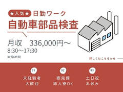 仕事内容【仕事内容】 工場内で、手のひらサイズの小さな部品をチェックする外観検査のお仕事です。 ・部品のキズや汚れがないか目で見てチェック ・検査した部品を箱に入れて仕分け ・ラベル貼りや数量確認などの簡単な補助作業 ・検査機器を使った確認作業(マニュアルあり) 扱うのは軽量部品が中心なので、体への負担はほとんどありません。 冷暖房完備の清潔な職場で、未経験の方でも安心して始められる環境です。 ライン作業ではなく、座りながらコツコツ進める作業が多いため、集中して取り組むのが得意な方にピッタリ。 「もくもく作業が好き」「安定して働きたい」そんな方におすすめです。 寮費無料の個室寮を完備してい