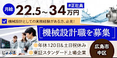 仕事内容<仕事内容> 産業用機械の電装設計、開発設計業務です。 産業用機械の電装設計、開発設計業務 ・回路設計、制御盤設計、機内配線、PLCプログラム、タッチパネル設計 ・マイコン基板設計、プリント基板設計 ・モータ制御、回路解析、磁場解析 ※製品種類別にチーム(ハード・ソフト)を組みプロジェクトを遂行します。 ※全ての業務を担当して頂く事はなく、今までのご経験に合わせて配属致します。 <給与> 時給2,200円~3,600円 <勤務時間> 固定時間制 完全土日祝休み <休日休暇> 完全週休2日制 ◇ 年末年始休暇 ◇ 年間休日120日以上 ◇ 夏季休暇 <勤務地> 広島県広島市安芸区船