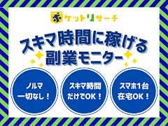 仕事内容<お仕事の一例> ◆サプリのお試しモニター◆ 大手健康食品メーカーのサプリメントを実際に試していただくお仕事です。 商品はご自宅に届くので、在宅で手軽に参加できます。 ・案件数 :10~20件 ・所要時間:10~20分 ・謝礼金 :1,500PT(1P=1円)+商品提供あり ◆クレジットカードの発行調査◆ クレジットカードを発行し、発行スピードや手続きのしやすさを調査していただきます。 最短5分で完了することもあり、高謝礼のため非常に人気です。 ・案件数 :10~20件 ・所要時間:10~20分 ・謝礼金 :2,000~5,000PT ◆オンライン保険相談モニター◆ オンラインで保険相談を体験