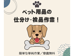 仕事内容【仕事内容】 お仕事内容例 《ペット用品の選別・検品スタッフ》 ペットグッズ(おもちゃ・おやつ・首輪・服など)を扱う倉庫で、 製品のチェックと仕分けをお願いします! 主な作業内容: ・汚れや破損、形崩れの確認 ・OK/NG品の仕分け ・種類ごとの袋詰め・梱包 ・ラベル貼り、検査票記入 同じ動作の繰り返しで覚えやすいお仕事! 重たいものもなく、体への負担が少ない職場です! 静かな環境で一人作業がメインなので、集中して働けます! ※掲載のお仕事内容は一例です さらに全国7,000件以上の同じような軽作業が多数あり、 希望に合わせて「日勤」「交代制」「寮付き」「週払い」など柔軟に選べ