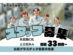 仕事内容人気のお仕事☆急募! 化粧品容器などの プラスチック製品を 製造している工場でのお仕事です。 <ここがポイント!> 化粧水など、さまざまな製品の 容器をつくる ものづくりに関わるお仕事です。 業務内容はいたって簡単で、 重たいものを扱うこともありません! 経験不問でどなたでも ご活躍いただけます。 もちろん空調完備で 清掃の行き届いたきれいな職場! 働きやすさもバツグンです。 <主なお仕事内容> ○外観検査 …基準に沿って 製品の見た目を目で見て確認し、 良品と不良品を 分けていきます。 ○ラベル貼り …製品本体、もしくは外箱に バーコード等が印字された シールの貼り付けを