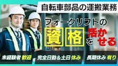 未経験歓迎!/大阪府柏原市/正社員/未経験OK!メーカー勤務/自転車・部品などの運搬作業/完全日勤&土日祝休み/河内国分駅・道明寺駅から徒歩圏内