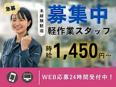 仕事内容簡単作業で高収入/ダイエット器具の梱包/月収30万円以上/日払い 軽作業でラクラク高収入 知識不要で8割以上の方が未経験からスタートしています お仕事内容はとってもシンプル 誰でもすぐに覚えられる軽作業です デスクワークより、もくもくコツコツとお仕事したい方にピッタリ 未経験でも初月から月収30万円以上も可能です ご興味のある方はまずは是非お気軽にご応募ください ▼当社からのご案内 株式会社デクリックマネジメントは製造業専門の転職支援を行なっております 「関わってくれたすべての人の人生が豊かになる”キッカケ”をつくる」という理念のもと お仕事のご案内だけでなく面接の対