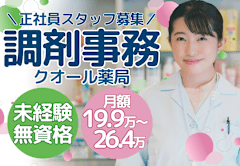 調剤薬局 調剤事務/週5日~/横浜市都筑区/月給19.9~26.7万円/未経験/クオール薬局港北店/正社員/賞与あり/調剤事務