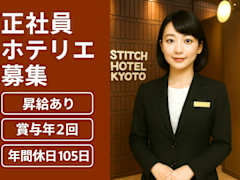 仕事内容<仕事内容> 【STITCH HOTEL Kyoto】京都のモダンなホテルでフロントスタッフ募集! 【STITCH HOTEL Kyoto】ホテルフロントスタッフ募集! 正社員 月給22~30万円|研修制度・昇給・賞与あり 【主な業務内容】 ・チェックイン/チェックアウト ・お荷物のお預かり ・観光案内 ・宿泊予約 ・オペレーター ・その他付随するフロント業務 ☆スムーズな英会話力を求められます。 【給与・待遇】 ○月給:220,000円~300,000円(残業代完全別途支給) ○昇給あり ○賞与あり(6月・12月) ○想定年収:3,080,000円~4,200,000円 ○年間休日10